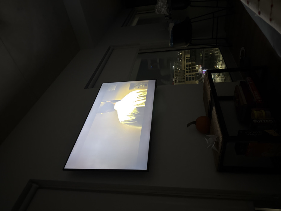- "A dimly lit room contains a television mounted on a wall, displaying a brightly lit scene with a person in a white shirt" by FM-S0Unw2, licensed under CC BY 4.0