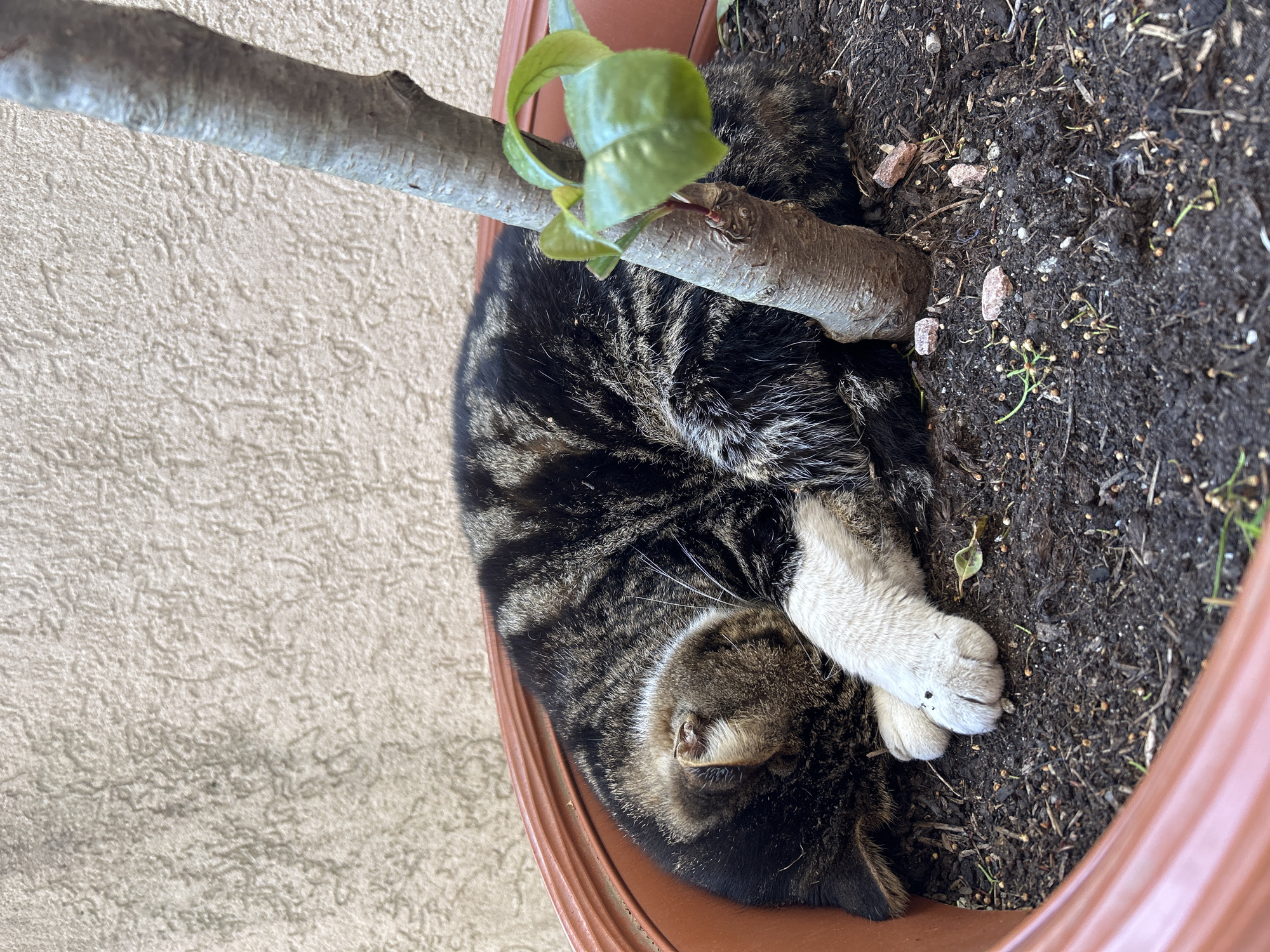 A cat is curled up asleep inside a brown planter pot, next to a plant stem