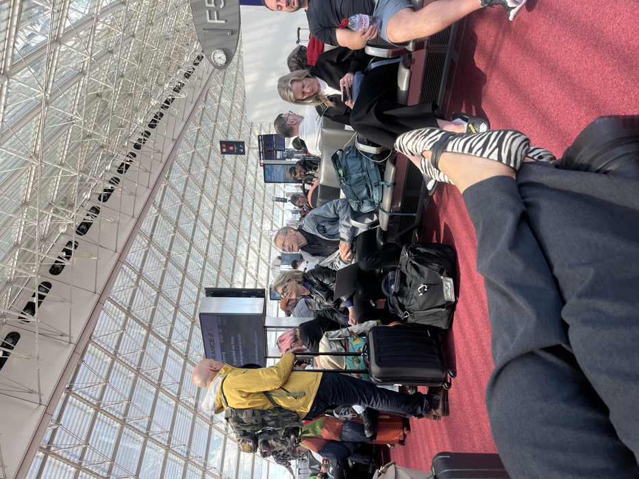 The image depicts a scene inside an airport terminal, likely in a waiting area. The location, based on the coordinates provided, is Charles de Gaulle Airport in Roissy-en-France, France. The scene shows a mix of travelers waiting, sitting on rows of seats with armrests and footrests. Several people are wearing backpacks, suggesting they are waiting for a flight. Some people are reading, others are looking at their phones, and some are conversing. One individual is laying their legs down on the seat, while others are sitting up with their arms crossed. Multiple suitcases are visible, and a person in a yellow jacket and a dark blue backpack stands next to a sign reading "France" with flight information. The ceiling is high and made of a complex metal framework with a grid pattern, allowing natural light to filter through. The floor is carpeted in red, which contributes to a sense of warmth and formality. The overall ambiance is one of calm anticipation, typical of a busy airport terminal.