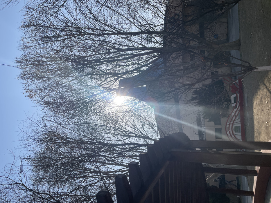 A sun-drenched scene features bare tree branches silhouetted against a bright blue sky. Sunlight pierces through the branches, creating lens flares. The branches obscure a building in the background, partially visible with white walls and a red architectural detail. A wooden structure with angled slats is in the foreground. The ground is visible with patches of dry grass.