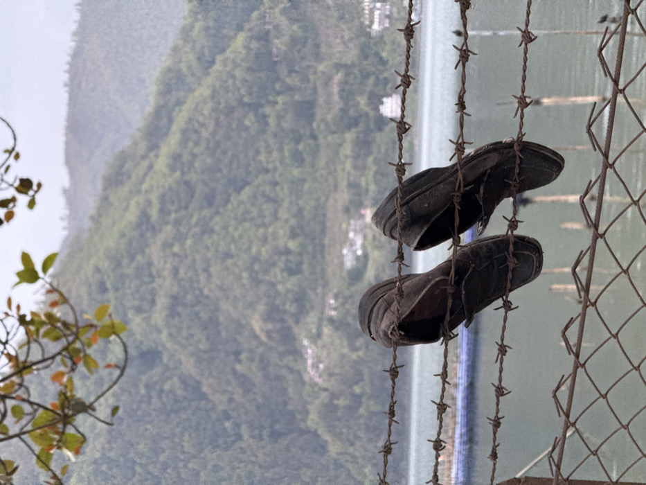 The image depicts an outdoor scene in Pokhara, Nepal, overlooking Phewa Lake. In the foreground, two dark-colored, worn, open-backed shoes are suspended on separate strands of barbed wire, which forms part of a fence. Below the barbed wire, a section of chain-link fence is visible. Partially seen at the top of the frame are tree branches with green and some orange leaves. The midground reveals the calm surface of Phewa Lake, with a faint blue, possibly netted or floating structure visible on the water to the left. The background consists of multiple layers of verdant, mist-shrouded mountains, with scattered white and light-colored buildings visible on their lower slopes. No individuals are present in the scene.