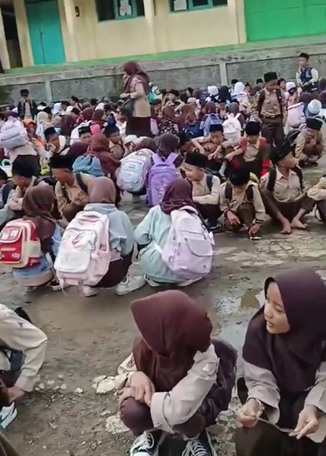 A group of students in brown and khaki uniforms are sitting on the ground in a schoolyard. Many have backpacks beside them. Some students wear hijabs. They are talking, smiling, and interacting with each other. Some are eating. The ground appears wet. Buildings are visible in the background. The overall atmosphere appears social and relaxed.