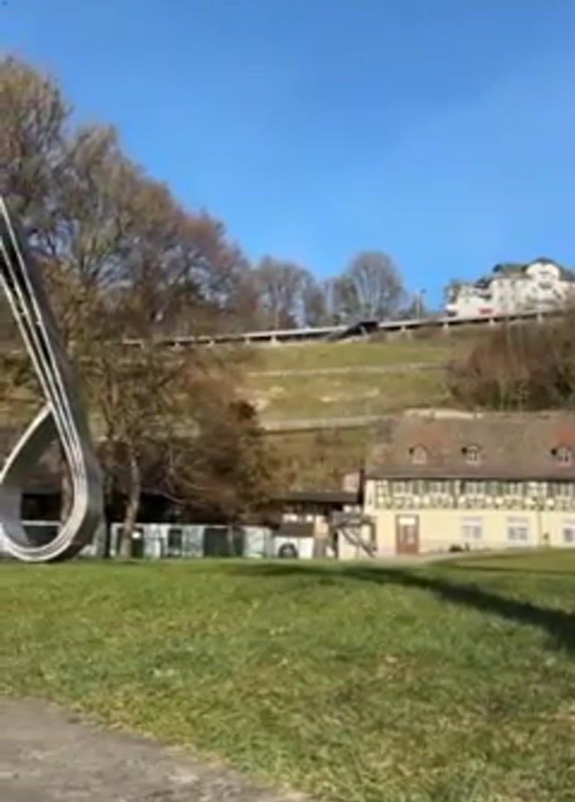 park on a sunny day with a large green lawn in the foreground. A modern metal sculpture stands on the left, partially obscuring the view. Beyond the lawn, there are several buildings, including traditional half-timbered houses with red shutters. A grassy slope rises behind the buildings, topped with a road or path and some modern buildings. The sky is clear and blue. The camera pans slightly to the right, revealing more of the buildings and the slope. There is a tree with bare branches on the left, and several other trees scattered throughout the scene.