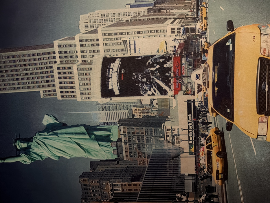 This image shows an illustrative scene of New York City rotated sideways. Key elements include the Statue of Liberty, classic yellow taxis, and recognizable skyscrapers. A prominent billboard displays a cinematic image. Street-level details depict pedestrians and a bank. The composition combines famous landmarks and city life, emphasizing urban density and cultural elements.
