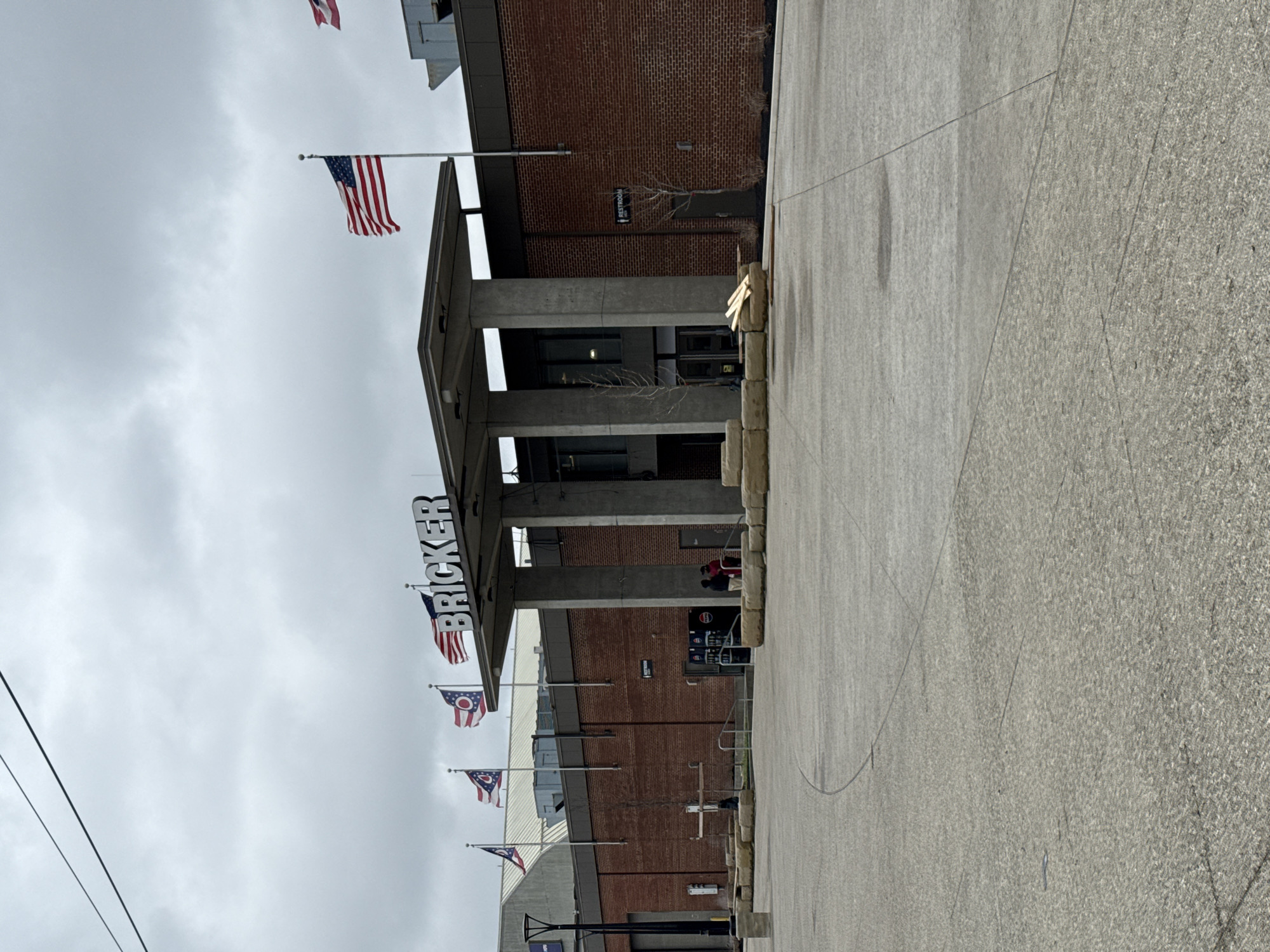 The image depicts the exterior of the Bricker Building, located at the Ohio Expo Center & State Fairgrounds in Columbus, Ohio, United States. The scene is under an overcast sky, presenting muted lighting conditions. In the midground, the Bricker Building's primary entrance is visible, characterized by a large concrete canopy supported by four substantial concrete pillars. Above the entrance, the name "BRICKER" is displayed in large white letters with red and blue accents. To the right of the entrance, an American flag flies from a pole, and to the left, several Ohio state flags are also flying from separate poles. The building's facade is predominantly red brick. A "RESTROOM" sign is affixed to the brick wall to the right of the main entrance. A Pepsi-branded vending machine is situated near the entrance, to the left of the restroom sign. In the foreground, a large expanse of light gray concrete pavement features visible expansion joints and some circular patterning. Several large, rough-cut light brown stone blocks are arranged in a semi-circular fashion in front of the building's entrance, acting as barriers. A small pile of light-colored lumber or planks rests on one of these stone blocks to the right. A single black lamppost stands on the far left of the frame. Two individuals are present near the vending machine, appearing to stand without overt interaction. One person is wearing a red top, and the other a darker garment. A third individual is faintly discernible further inside the building's entrance area. Two bare deciduous trees are planted near the entrance pillars.