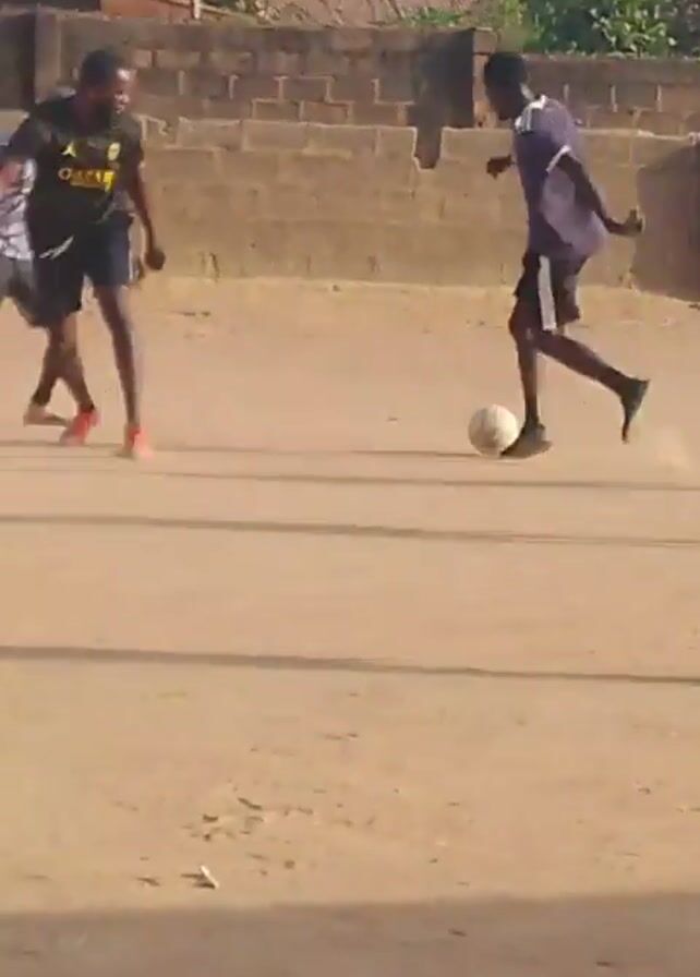 The video depicts a group of young men playing soccer on a dirt field