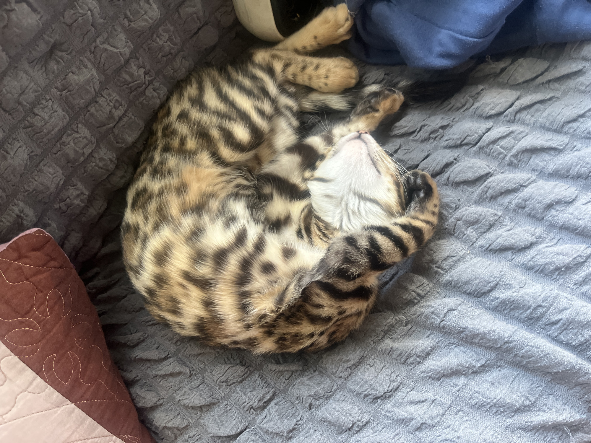 - "An indoor scene in Kostinbrod, Bulgaria, displays a domestic cat, identified by its tawny and black striped and spotted (marbled/rosetted) coat, curled in a sleeping position on a grey, textured blanket" by FM-LxPoh1, licensed under CC BY 4.0
