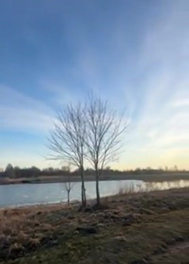 The camera pans slowly to the right across a landscape scene. The foreground shows a strip of land with grass and brown foliage, transitioning into the edge of a body of water. The water appears calm and has a slightly reflective surface. Three bare trees stand in the foreground, close to the water's edge. Beyond the water, there's a strip of trees lining the horizon. The sky is a gradient of blue, with wispy clouds stretching across it. As the camera pans right, the sun appears, partially obscured by the trees on the horizon. A narrow dirt path is revealed along the water's edge.