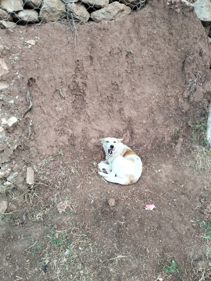 A dog lies curled on the ground near a dirt embankment, its mouth open in a possible yawn or bark. The dog is predominantly white with patches of brown. Above the embankment, stones are held together by a wire mesh. The ground around the dog is sparse, with patches of grass and scattered debris, including what appears to be a piece of pink trash. The scene is lit naturally, with a focus on the dog.