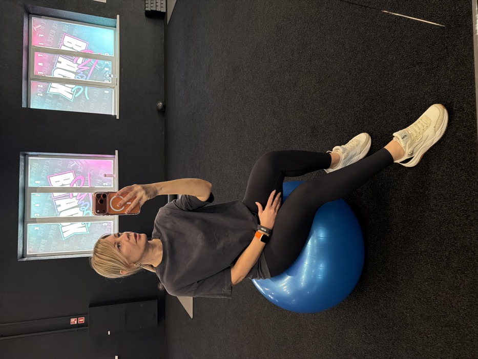 An adult female is depicted taking a mirror selfie inside the "BLACK HACK" fitness studio, located at Ulitsa Astrakhanskaya, 21, Anapa, Russia. The female, appearing to be in her 30s-40s with blonde hair, is seated on an inflated blue exercise ball on a dark, textured rubber floor. She is dressed in a charcoal grey oversized t-shirt, black leggings, and white/cream athletic shoes. An orange-banded smartwatch is visible on her left wrist. Her right hand holds an orange-cased smartphone to capture the image, while her left hand rests on her left thigh. She gazes slightly to her right, past the phone. The background consists of dark grey walls with two rectangular windows featuring translucent decals displaying "BLACK" and "HACK" in stylized neon pink and blue lettering. Additional gym equipment, including black cabinets, a grey exercise mat, a black medicine ball, and a stack of weights, are partially visible within the facility. The scene is illuminated by internal artificial lighting.