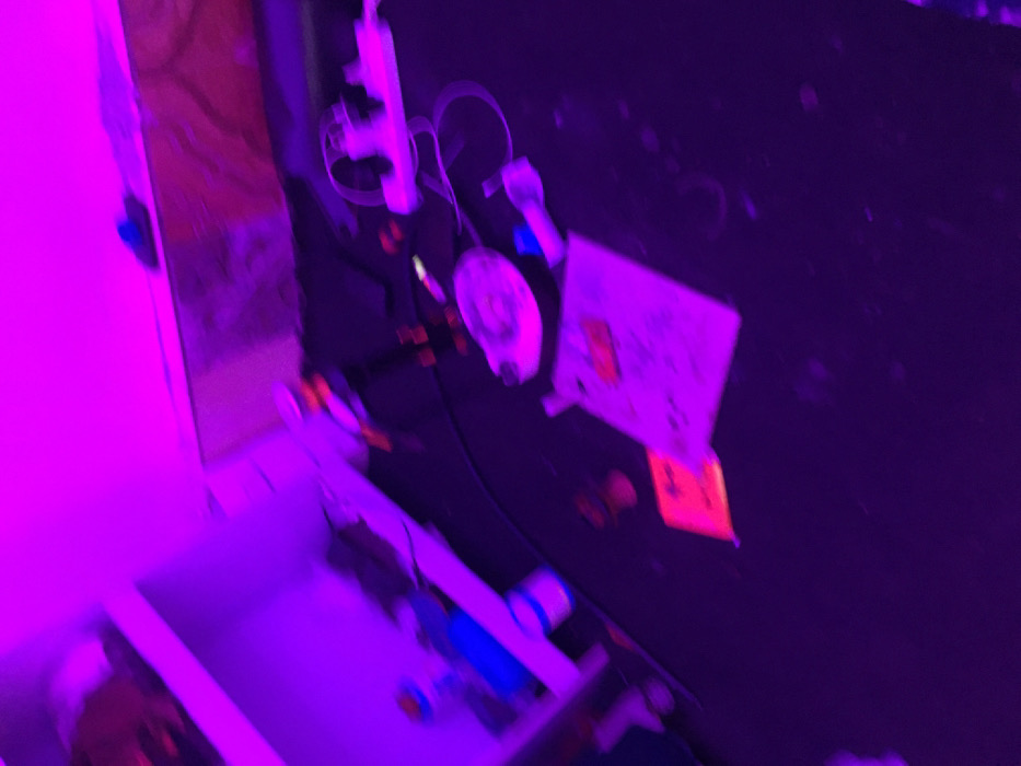 A blurry, purple-toned image depicts a desk or table with various objects. A white object with cords is visible, along with a notebook or paper with writing or drawings on it. A drawer below is partially open, revealing assorted items inside, including a blue cylindrical object. The desk surface has some scattered small objects. The lighting is predominantly purple, obscuring details and creating a sense of disorientation.
