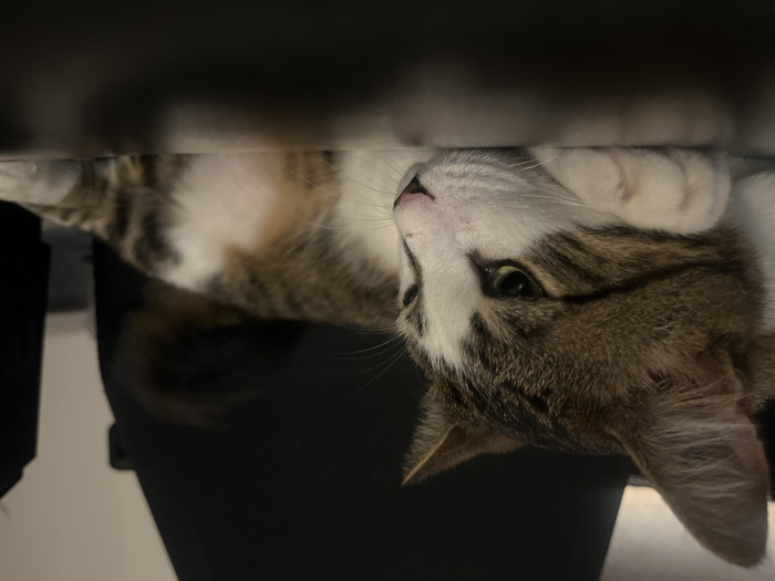 - "A domestic short-haired cat, exhibiting a white and brown tabby pattern, is captured lying prone on a dark, flat surface" by FM-xxu5D3, licensed under CC BY 4.0