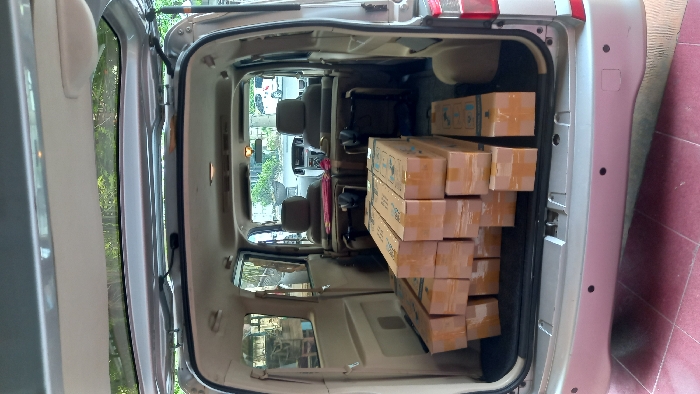 A light-colored multi-purpose vehicle (MPV) is depicted from the rear with its tailgate open, parked on a reddish-brown tiled surface in Sidoarjo, Indonesia. The vehicle's cargo area is filled with multiple rectangular cardboard boxes, sealed with brown packing tape, stacked in layers; at least 21 boxes are visible. The rear seats are stowed or removed, providing a flat cargo floor. The vehicle's interior features two light-brown upholstered front seats, with the dashboard and steering wheel visible forward. Through the vehicle's windows and front windshield, green foliage and a portion of a white vehicle are discernible in an outdoor background. The lower section of the vehicle's silver rear bumper, equipped with two black circular parking sensors, is visible at the bottom of the frame. No individuals are present in the scene.