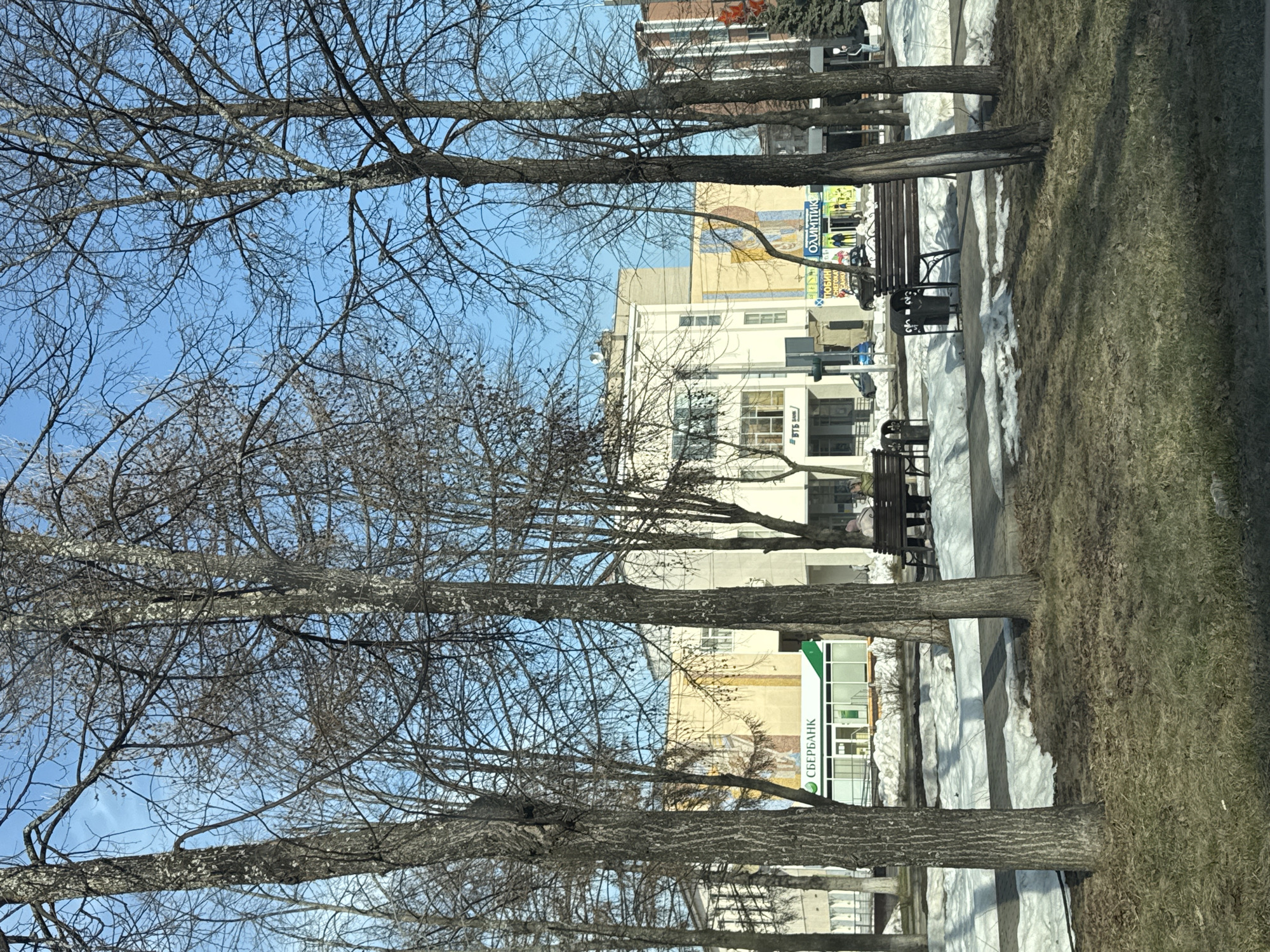 The image depicts a row of bare trees lining a walkway in Chaikovsky, Russia. Patches of snow remain on the ground adjacent to the path and grassy areas. Benches and trash receptacles are visible along the walkway. Buildings are visible behind the trees, including one with a СБЕРБАНК (Sberbank) sign and another with a mural titled "ОЛИМПИК". The sky is blue and mostly clear. No people are clearly visible.