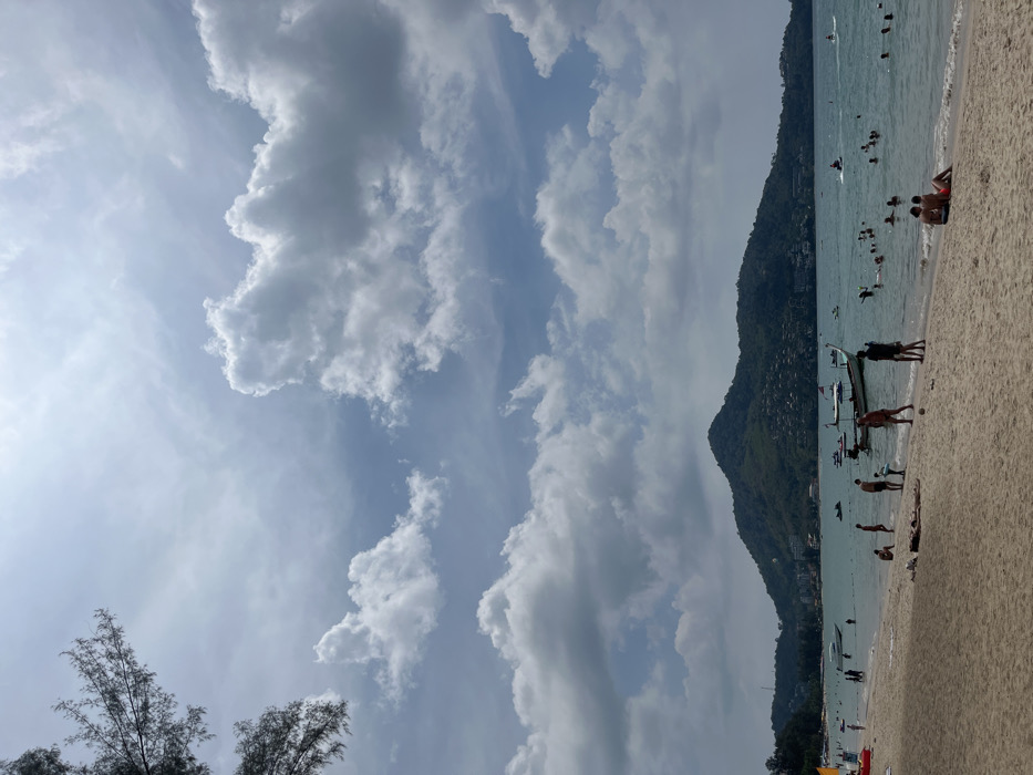 A picturesque scene depicts a sandy beach teeming with people enjoying the water and sunshine. Adjacent to the shore, a verdant mountain rises, adding depth and texture to the landscape. The sky is adorned with billowy white clouds, creating a dynamic contrast against the blue expanse. Trees are visible in the foreground, adding a touch of nature to the overall scenic composition.