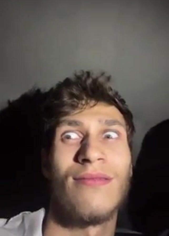 A fair-skinned young man with brown hair and a thin beard is looking directly into the camera. He is making exaggerated facial expressions, including widening his eyes, grinning broadly, and laughing. He appears to be sitting in a car, as the background is dark with a vague shape suggesting a car interior. He is wearing a white shirt. The lighting is uneven, creating shadows on the ceiling and the side of his face.