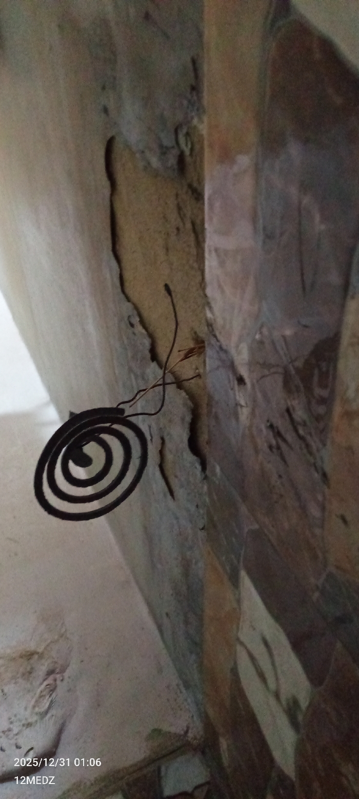 A spiral object hangs by wires against a damaged wall. The wall exhibits peeling paint, revealing a beige layer beneath, with a vertical structural element displaying a mosaic-like pattern of browns and grays. The wall's condition indicates deterioration, while the hanging object's purpose remains unclear, possibly a decorative or functional item.