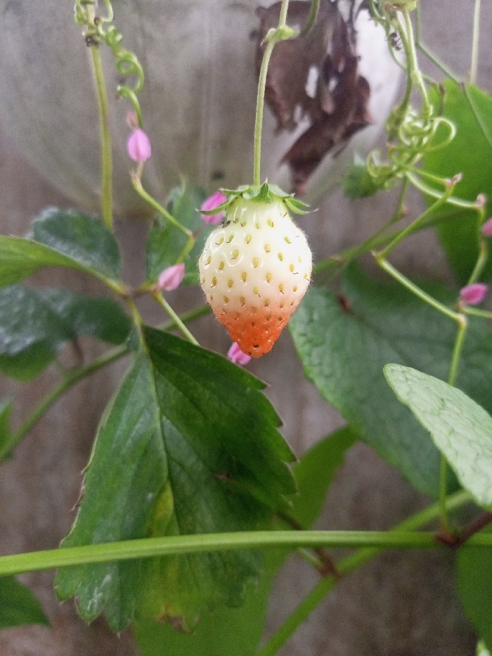 The image depicts a partially ripened strawberry fruit, centrally positioned and hanging from a thin green stem. The fruit displays a color gradient, transitioning from pale white to yellowish-white in its upper two-thirds to an orange-red at its pointed base. Small, visible achenes are present across its surface. A green calyx surrounds the stem attachment point. Surrounding the strawberry is a dense arrangement of green foliage, including serrated strawberry leaves, slender green stems, and coiling tendrils. Several small, elongated, closed pink flower buds are scattered among the vegetation. A small, dark-colored ant is visible on a leaf in the upper right portion of the frame, and another minuscule dark speclike object is on the strawberry's calyx. The background consists of a blurred, light gray-brown wall or structure, with irregular darker brown elements, possibly dried foliage, adhering to it. The scene is illuminated by ambient light. This scene is located in Bamhori, India.