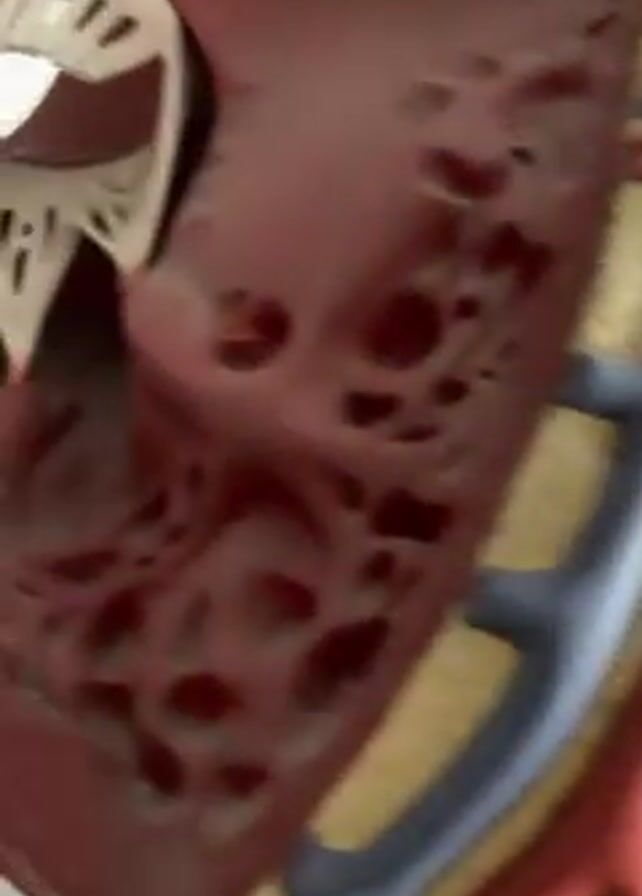 close-up view of a plastic anatomical model of the human heart, cut open to reveal internal structures. The focus is on the mitral valve, depicted with white chordae tendineae extending from the valve leaflets. The heart's chambers, including the right atrium and ventricle, are visible, with their characteristic textured surfaces. The model is made of red and yellow plastic, with some blue and grey accents indicating blood vessels. The background shows a glimpse of what appears to be a tiled wall and a metallic surface, suggesting a laboratory or educational setting. The camera moves slightly, providing different angles of the heart model.
