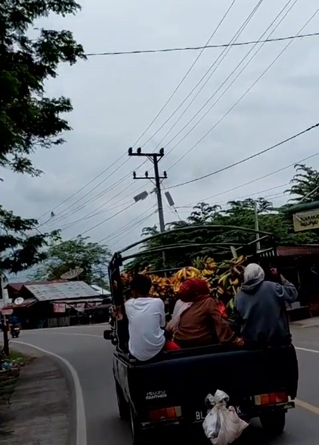 A black pick-up truck with “ISUZU PANTHER” on the back drives along a grey, asphalt road. The truck bed is full of bunches of bananas, with three people sitting on the back. One person is wearing a white shirt, another a brown shirt and headscarf, and the third a grey sweatshirt and headscarf. The truck drives on a road with houses and power lines on both sides, passing motorbikes going in the opposite direction. The sky is grey and cloudy.