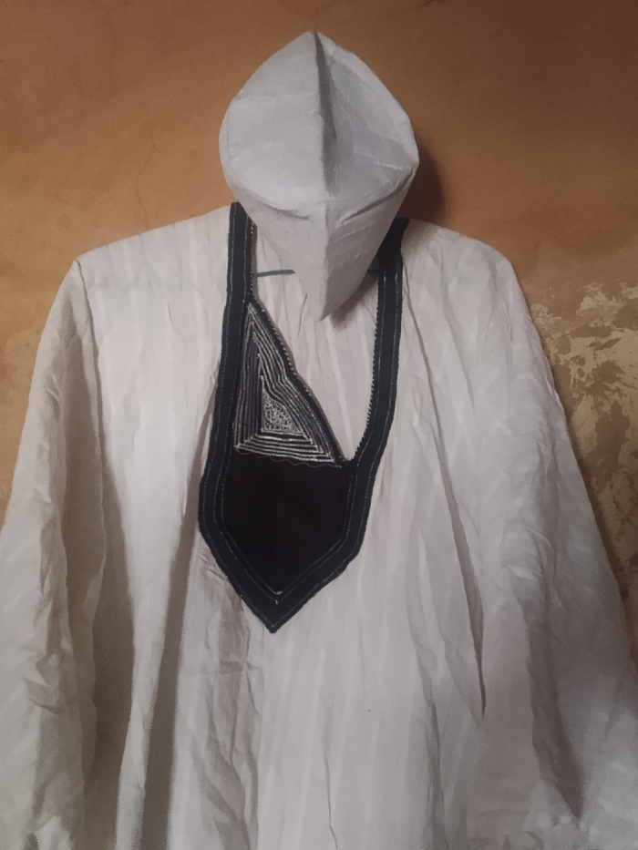- "A light-toned, off-white traditional Nigerian garment, likely a babariga or kaftan, is displayed against an earthy-brown, textured wall in Jos, Nigeria" by FM-2CNDq1, licensed under CC BY 4.0
