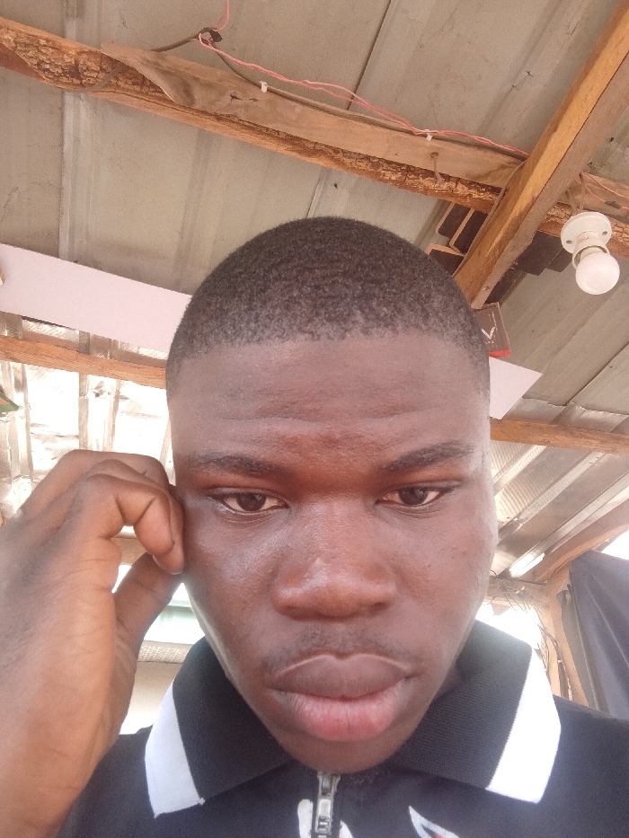 The image presents a close-up, frontal view of an adult male with dark skin and a short, dark buzz cut. He is wearing a black polo shirt with a white collar and a partially visible metallic zipper. His right hand is positioned against the right side of his head near his temple. The individual maintains direct eye contact with the camera, exhibiting a neutral expression. The background details an overhead structure composed of corrugated metal sheeting supported by rough, unpainted wooden beams. Pink electrical wiring is visible, secured along the wooden framework. A white, spherical light bulb in a white fixture hangs from a wooden beam on the upper right side of the frame. Additional light-colored structural elements are partially visible in the upper left background. The specific location within the city of Zango-ndaji, Nigeria, cannot be determined from the visual information provided.