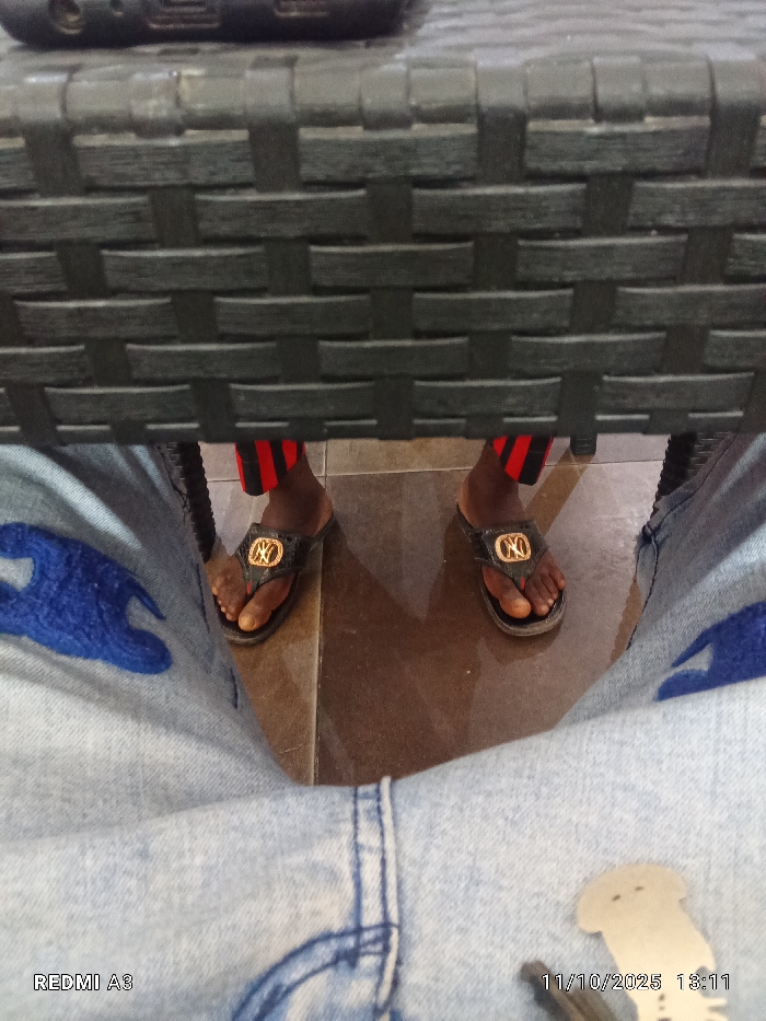 The image captures a first-person, downward-angled view from a seated position, depicting a scene in Onitsha, Nigeria. In the immediate foreground, the photographer's light-wash denim jeans are visible, featuring a blue embroidered or patched design on the left leg. A small, light-colored, irregularly shaped object, possibly a key or charm, rests on the right thigh area of the jeans. A dark, intricately woven (wicker-style) table or barrier occupies the midground, extending horizontally across the frame. A dark mobile phone is positioned on this surface in the upper left corner. Beneath the table, the lower legs and feet of two individuals are visible on a tiled floor. Both individuals wear dark trousers with distinctive red and black vertical stripes. Each person wears a dark, open-toed sandal featuring a gold, circular emblem with a stylized "NY" or similar monogram. The left foot is slightly more prominent, showing the individual's skin tone. The floor appears to be composed of light brown tiles, exhibiting some reflective sheen. A timestamp "11/10/2025 13:11" is present in the bottom right corner, partially obscured, along with the device model "REDMI A3" in the bottom left. The setting appears to be an indoor environment, likely a cafe or similar establishment, where individuals are seated at a table.
