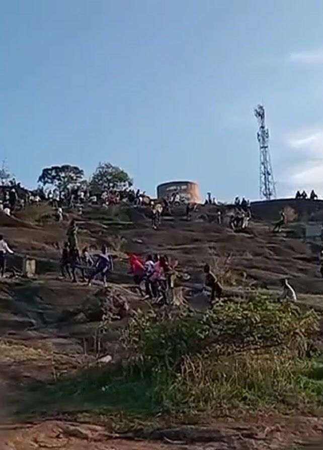 crowd of people, mostly children, climbing and walking around on a large rocky hill under a blue sky. The hill has some green vegetation and a few trees. At the top of the hill, there is a cylindrical structure that appears to be a water tower, and a communication tower is also visible in the background. The children are dressed in various casual clothes, and some are running and playing. The video appears to be taken from the base of the hill, looking upwards.