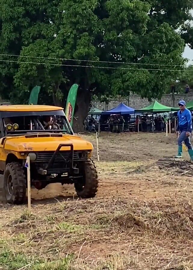 In a medium shot, a yellow off-road vehicle navigates a muddy course during an outdoor event