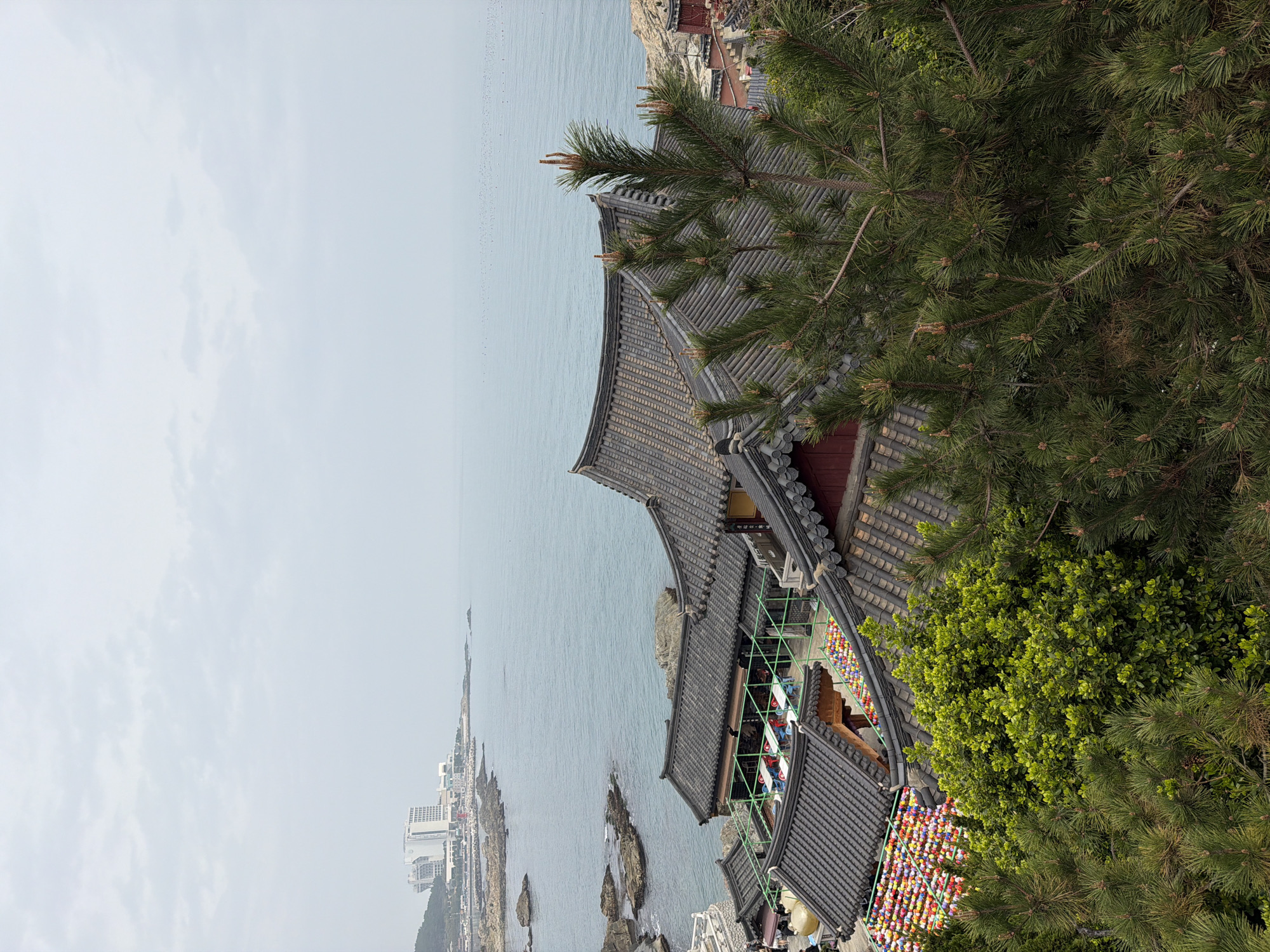 The image captures a view of the Haedong Yonggungsa Temple in Busan, South Korea, nestled along the coastline. The temple's tiled rooftops, adorned with traditional Korean architecture, are visible amidst green trees. The sea stretches out in the background, with the city skyline visible in the distance. Colorful lanterns hang along the temple structures. There are people in the lower part of the image. Scaffolding is visible.