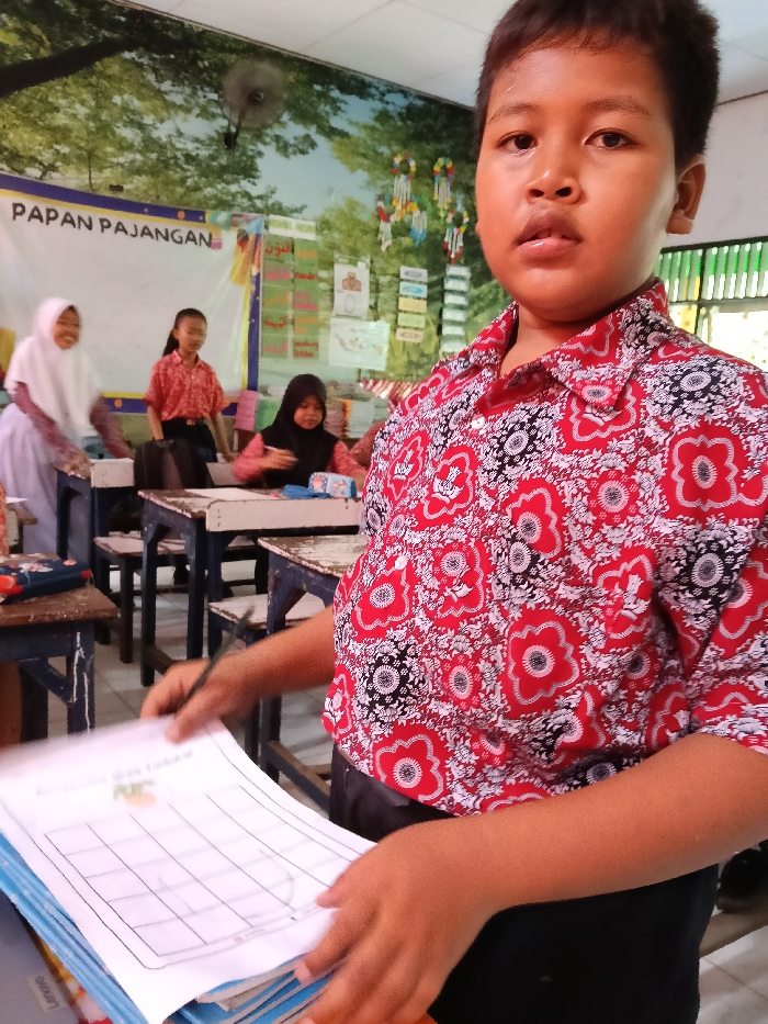 A boy in a red and black floral shirt holds papers with a grid in a classroom. Behind him, three girls sit at desks. One wears a white hijab, another has a black hijab, and the third has her hair down. The classroom features a bulletin board with the word "PAPAN PAJANGAN" on it and a mural depicting trees. A ceiling fan is visible. The classroom is brightly lit.