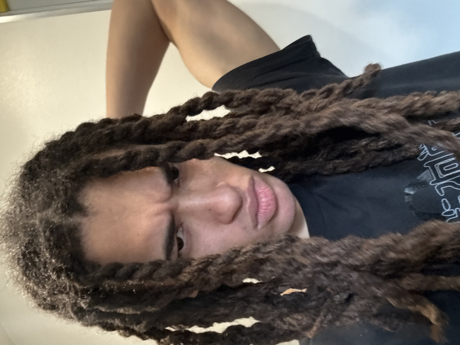 The scene is located in Les Ulis, France. A single individual is captured in a close-up portrait, displaying light brown skin and numerous long, dark brown dreadlocks, some appearing tightly twisted. The subject wears a black short-sleeved t-shirt featuring a partially visible light-colored graphic design on the chest. The individual's facial expression conveys an exaggerated pout: eyebrows are furrowed, eyes are slightly narrowed, and lips are pursed downwards. The subject's right arm (viewer's left) is raised and bent at the elbow, with the forearm and bicep visible as the hand is positioned behind the head, out of frame. The background is a plain, light-colored wall, devoid of distinguishing features.