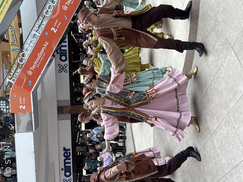 An indoor cultural performance is documented within a multi-level shopping mall in Petropavl, Kazakhstan