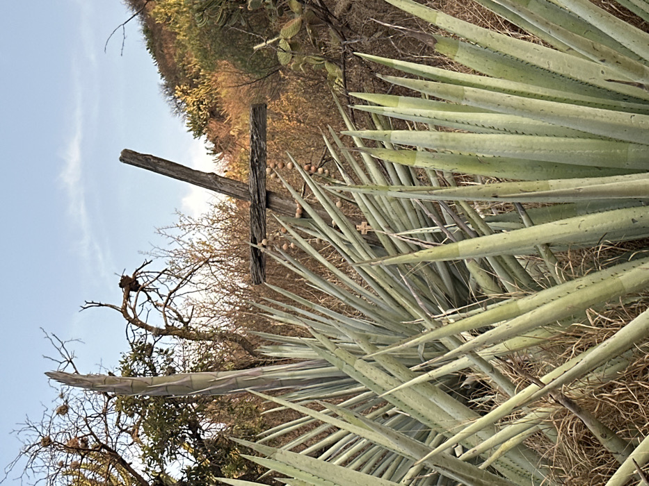 The scene depicts an arid landscape in Corregidora, Mexico. In the midground, a weathered, dark brown wooden cross stands vertically, with its horizontal beam extending left and right. A string of light-colored, spherical beads, consistent with a rosary, hangs from the horizontal beam of the cross. A smaller, lighter-colored cross is visible to the lower right of the main cross, partially obscured by foliage. The immediate foreground is densely populated with numerous agave plants, characterized by long, sharp, pale green leaves. Dry, straw-colored grasses are interspersed among the agave plants. To the left, a tall, vertical agave stalk (quiote) rises. The background features a mix of deciduous trees and shrubs with sparse foliage and bare branches, some containing spherical nests or galls. On the far right, a hillside covered with similar vegetation and cacti ascends. The sky is light blue with minimal cloud cover, indicating daytime. No human or animal subjects are present. All objects are stationary.