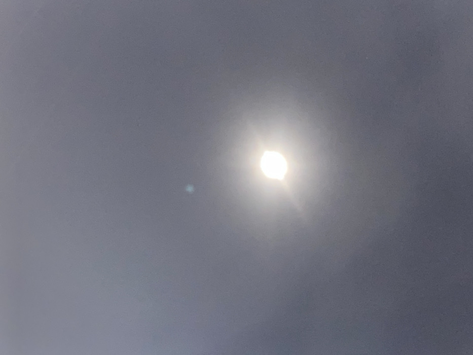 The scene, set in Jos, Nigeria, displays an overcast or hazy sky. A brilliant, circular light source, consistent with the sun, is prominent in the lower-middle of the frame, emanating intense white-yellow light and exhibiting visible lens flare. The surrounding sky presents a uniform, muted grey tone. A small, faint, greenish-blue light artifact is discernible in the upper-left quadrant. No ground features, structures, people, or specific objects are present within the frame; the image is exclusively of the sky.