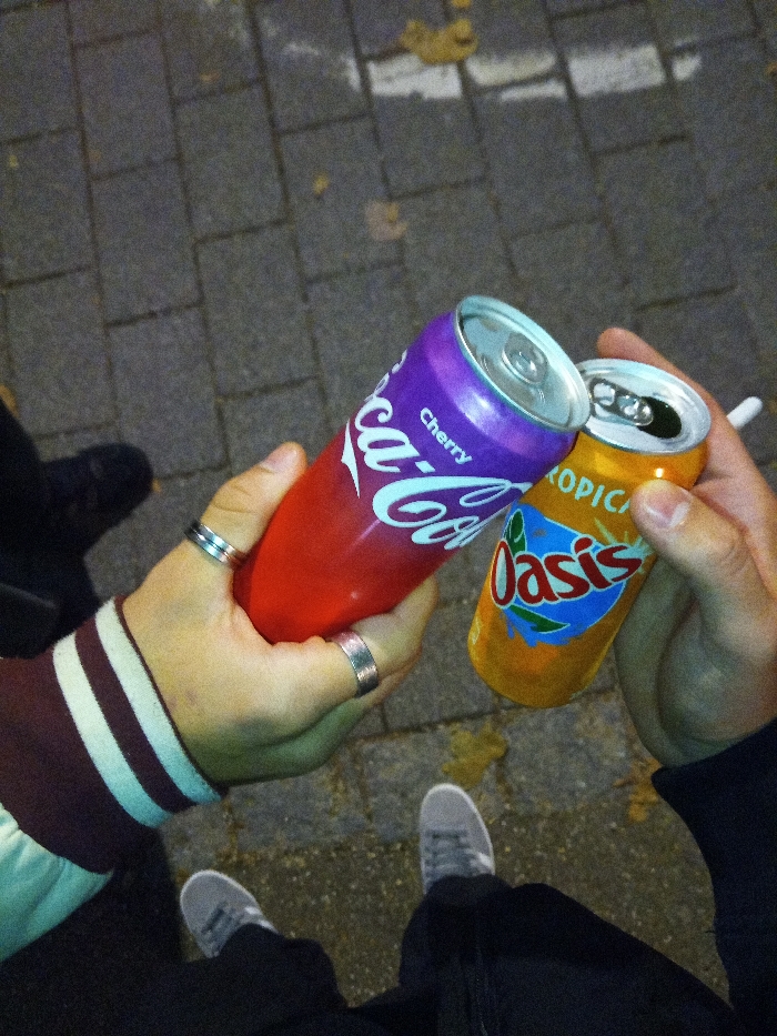 - "The image presents a downward, high-angle perspective of two individuals holding beverage cans over a paved surface" by FM-bs3Hw2, licensed under CC BY 4.0