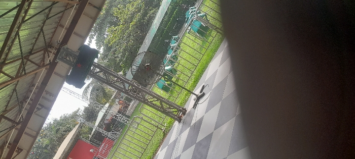 The image depicts an outdoor event or recreational area, likely within Abuja, Nigeria, viewed from under a covered structure. In the immediate foreground, a black and white checkered floor pattern is visible, extending towards the bottom and left. Above, a corrugated metal roof is supported by metal beams. A prominent, tall, grey metal truss structure stands on the checkered floor. Attached high on this truss is a black rectangular speaker or lighting unit, featuring a red star-like emblem on its side. Adjacent to the truss, on the checkered floor, is a black metal pedestal fan with a circular protective cage. Beyond a low metal barrier fence separating the covered area, a vibrant green grassy lawn extends into the midground. Scattered across this lawn are multiple light blue or turquoise plastic chairs, some appearing overturned or in disarray. Further into the background, a temporary stage or event setup is discernible, characterized by white canopies, metal scaffolding, and additional equipment. A red building is partially visible on the far left, behind the temporary structures. The background is dominated by dense green trees and foliage, with a tall, slender metal tower or mast faintly visible against a bright, overcast sky. No individuals are present in the visible scene. The precise location within Abuja is not identifiable from the image, but the setting suggests an outdoor park, event venue, or resort.