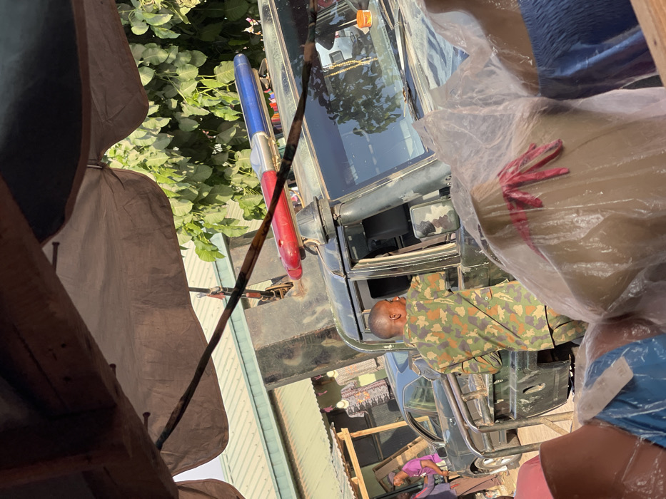 The image captures an outdoor urban market street scene in Samaru, Nigeria, under bright daylight. In the foreground, a beige fabric awning supported by wooden beams partially obscures several display mannequins or busts. One mannequin, covered in clear plastic, exhibits a red, five-pronged object on its chest. Another, also plastic-wrapped, displays a blue garment. In the mid-ground, a dark green military-style utility vehicle, possibly a SUV or pickup with a canopy, is parked. It features a roof-mounted emergency light bar with red and blue sections and has visible exterior protection bars. A male individual, appearing to be of African descent, with short dark hair, is seen from behind, wearing a green camouflage military uniform. He is positioned at the driver's side door of the military vehicle, appearing to lean into or enter the cabin. Behind this vehicle, a dark-colored sedan is partially visible. Further to the left, a second male individual, wearing a purple shirt, stands near the sedan. The background shows a street environment with buildings, one of which displays hanging clothing merchandise. Above the structures, abundant green foliage from trees is visible against a bright, clear sky.