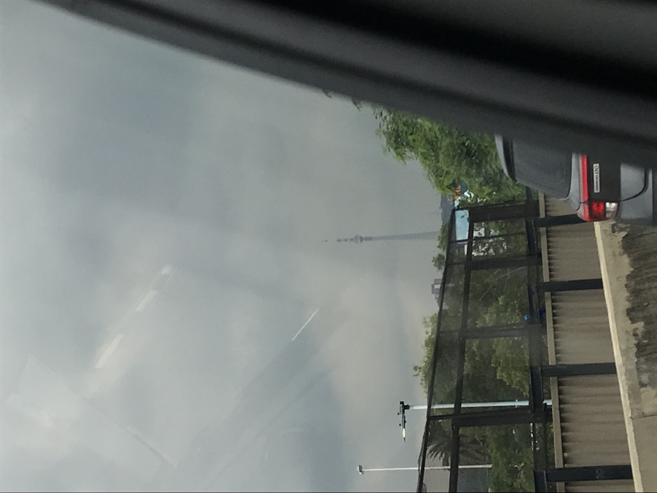 The scene depicts an urban landscape in Johannesburg, South Africa, observed from inside a vehicle on an overcast day. The prominent Hillbrow Tower is visible in the distant center, partially obscured by a dense, uniform gray cloud cover. In the immediate foreground, a dark vertical element, likely part of a vehicle's A-pillar or door frame, occupies the right side of the image. Below, a concrete barrier, consistent with a highway or overpass wall, spans the bottom, topped by a dark, mesh-patterned metal fence. A gray Hyundai Grand i10 compact car is partially visible on the right, ahead of the photographer's vehicle, facing away. To the left, two streetlights of differing heights, one tall pole with a single luminaire and a shorter pole with a rectangular fixture, are positioned behind the fence. Green foliage from trees is present between the fence and the distant cityscape, which includes indistinct buildings at the base of the tower. No individuals are visible.