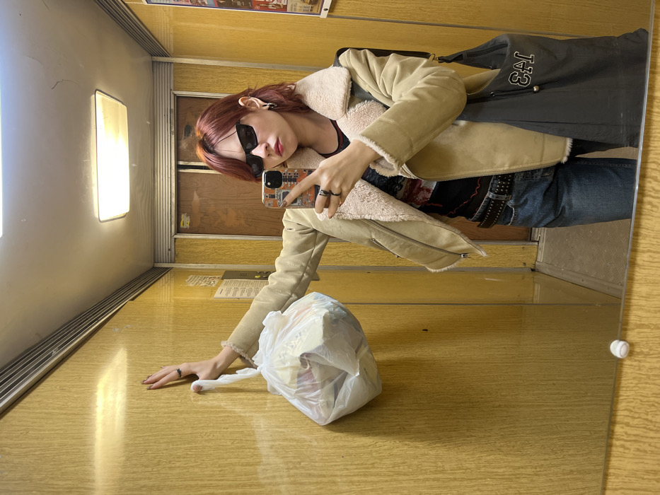 The scene depicts a young adult female taking a mirror selfie inside an elevator car in Krasnoyarsk, Russia. The elevator features yellowish-brown, vertically paneled walls displaying signs of age and wear. A rectangular ceiling light fixture provides illumination. The female has shoulder-length, reddish-brown hair and wears dark, cat-eye style sunglasses, obscuring her eyes. She wears multiple rings on her fingers and dark-painted fingernails. Her attire includes a dark graphic t-shirt, an unzipped beige faux-suede jacket with cream-colored sherpa lining, blue denim jeans, and a studded black belt. A dark grey shoulder bag with the white text "САГ" is slung over her right shoulder. With her left hand, the female holds a full, white plastic bag by its handle, pressing her hand against the elevator wall. Her right hand holds a smartphone with a patterned case, angled to capture her reflection. A closed, dark elevator door is visible in the background, along with the reflection of an elevator control panel on the right side. The floor is dark and textured. A small, white, spherical object rests on the bottom edge of the mirror's surface.