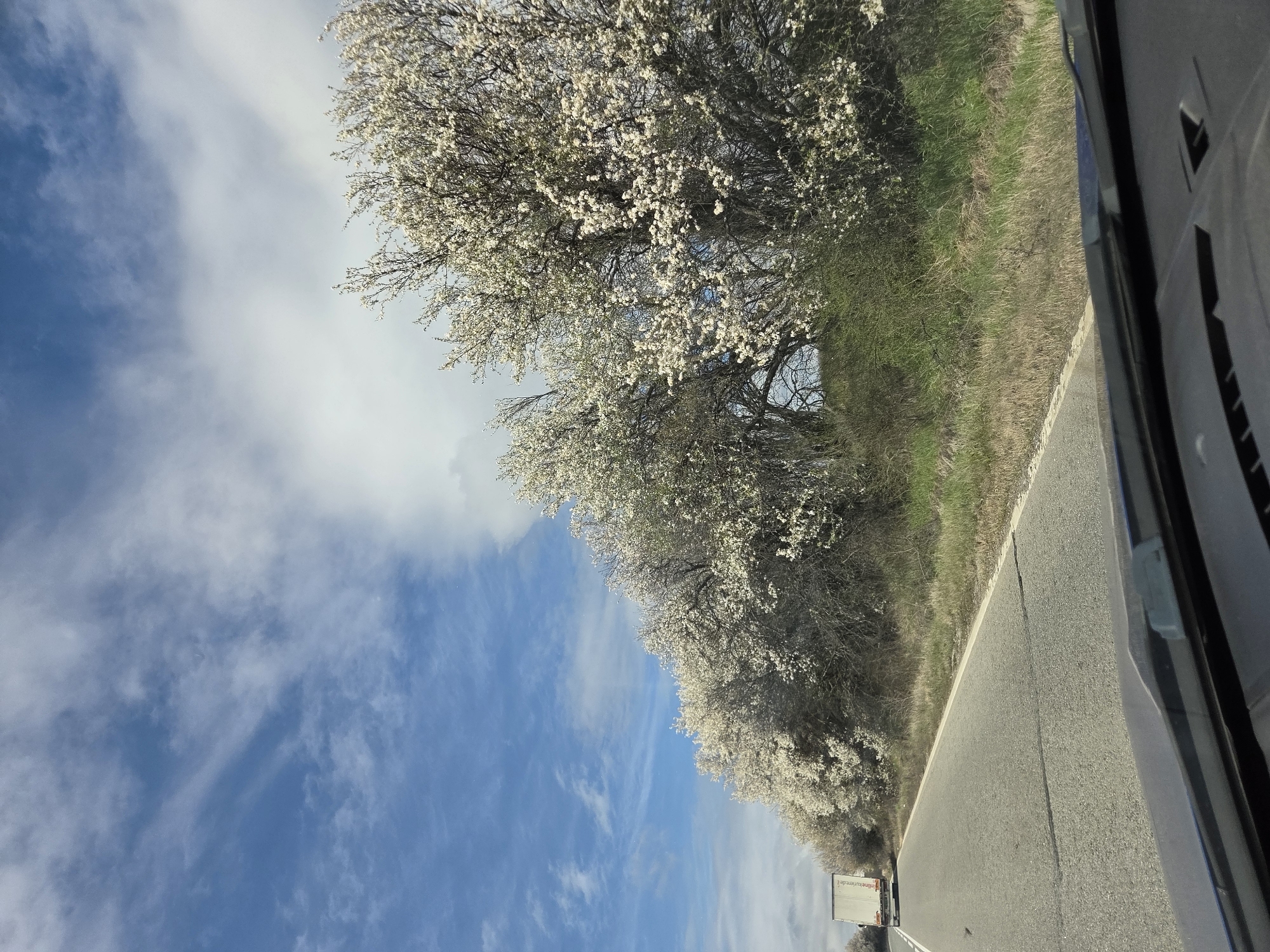 A roadside view, likely taken from inside a vehicle, shows a road lined with flowering trees. The sky is visible in the upper left portion of the image, displaying blue with streaky clouds. A grassy verge is adjacent to the road, followed by the trees in full bloom. A white truck is visible on the road in the distance. The photo appears to be slightly rotated counter-clockwise. It is unknown whether the image was taken near the city of Panicharevo, Bulgaria.