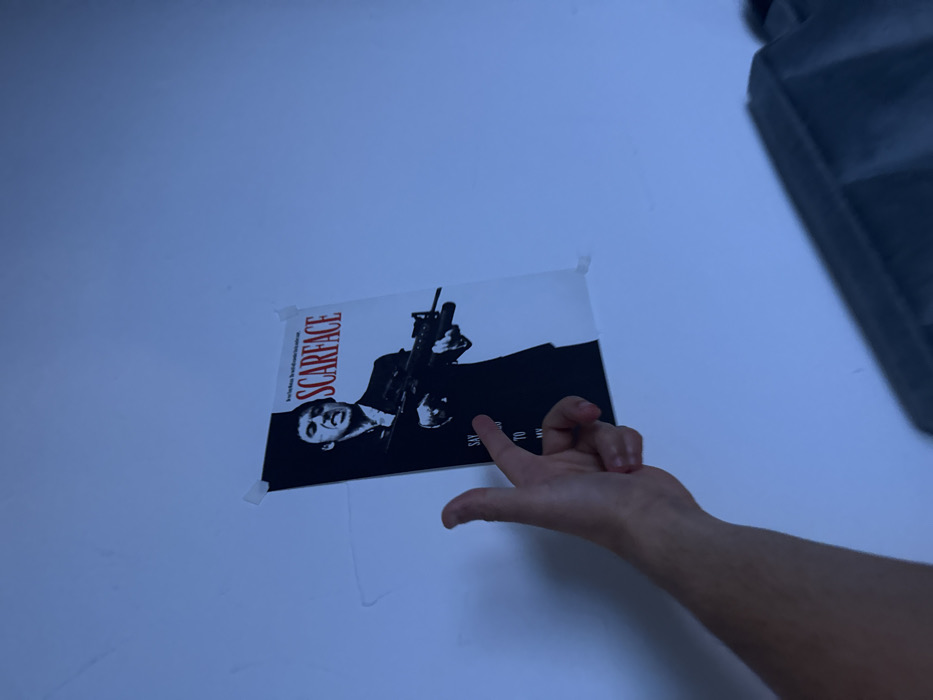 The image displays an interior scene featuring a light-colored wall, possibly white or pale blue, under ambient illumination. A "Scarface" movie poster is centrally affixed to the wall, secured by clear adhesive tape at each corner. The poster depicts a monochromatic graphic of Al Pacino as Tony Montana, wearing a suit and brandishing an M16 assault rifle, with an intense facial expression. The movie title "SCARFACE" is prominently displayed in red capital letters above the character. Below the character, partial text reading "SAY" and "TO MY" is visible. In the lower-left quadrant, a human right arm extends towards the poster. The hand forms a gesture with the thumb pointing upwards and the index finger extended horizontally, directing attention towards the central figure on the poster. A dark, angular object, consistent with a piece of furniture, is partially visible along the lower right edge of the frame. The visual evidence within the image does not provide information to identify a specific location within Strasbourg, France.