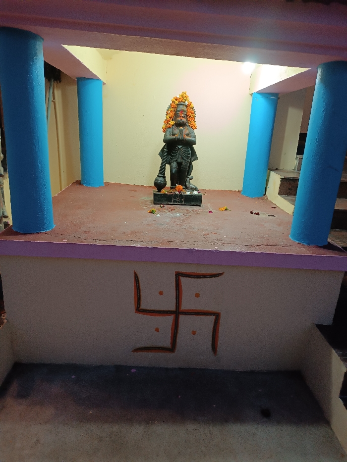 An illuminated shrine or small temple structure is depicted in Koyalaguttapalli, India. The central subject is a dark-colored statue, approximately three feet tall, standing on a black rectangular pedestal. The statue, depicting a deity with hands clasped in prayer (Anjali Mudra) and a mace (gada) beside its left leg, is adorned with an elaborate orange and yellow floral garland on its head. Red markings are visible on its forehead. The statue is positioned on a raised platform with a reddish-brown floor, which is supported by a light pink-purple trim. Four blue cylindrical pillars support a flat ceiling above the platform. The rear wall is painted a light yellow or cream color. Artificial lighting illuminates the statue from above. Below the raised platform, a lighter-colored wall features a prominent painted Swastika symbol in orange with black outlines and four orange dots within its quadrants. The ground level below this wall is a darker concrete surface. To the right of the platform, a set of brown steps ascends upwards, partially obscured by one of the blue pillars. Scattered orange and yellow flower petals, along with white powder or chalk markings, are visible on the platform around the statue's base and on the ground to the right. A vertical pipe is partially visible on the left side, behind a blue pillar.