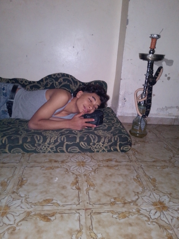 A young man lies on a patterned couch with a black, boxy object near his head. He is wearing a gray tank top and blue jeans. The room has a simple, light-colored wall and a tiled floor with a floral pattern. A hookah stands upright next to the couch. The overall lighting appears somewhat dim and possibly artificial.