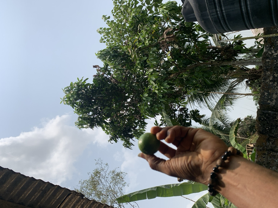The scene is an outdoor, upward-angled view in Ikot Ete Ekpo, Nigeria, under a clear sky with scattered white cumulus clouds. In the foreground, a dark-skinned right hand holds a small, spherical green fruit, approximately 5 cm in diameter, consistent with a lime, elevated against the sky. A dark, multi-beaded bracelet is visible on the wrist. To the upper left, a section of a dark brown, corrugated metal roof is present. Below the roof and partially obscured by the hand, a large green banana leaf is visible. The midground and background are dominated by dense tropical vegetation, featuring multiple tall green trees with varied foliage, including a prominent tree with large, dark green leaves (consistent with a mango tree) and parts of a palm tree. In the lower right corner, a segment of a black, cylindrical plastic water storage tank is visible, situated above a textured, light-colored concrete or stone wall. The environment appears brightly lit by natural sunlight.