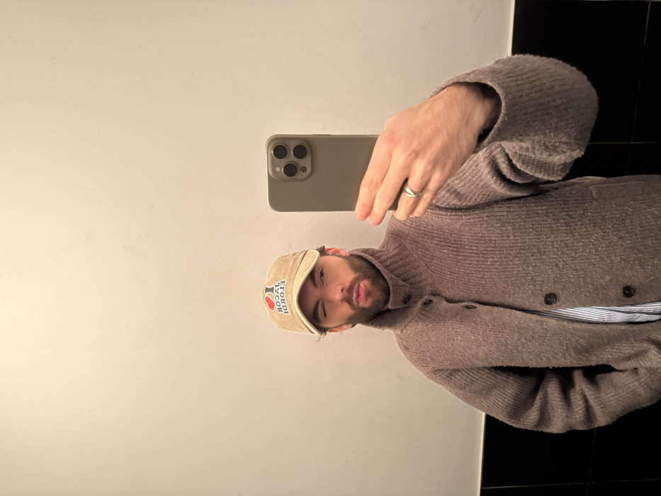A male individual, reflected in a mirror, captures a selfie. He wears a beige baseball cap displaying the mirrored text "I ❤️ JACOB ELORDI," a textured, ribbed, taupe-brown high-neck cardigan with dark buttons, and a visible light blue and white striped shirt underneath. He has a dark beard and mustache. His right eye is closed in a wink, and his lips are pursed. He holds an olive green smartphone, featuring a triple-lens camera array, in his left hand. A silver-toned ring is present on the ring finger of his left hand. The background consists of a plain, light-colored wall above a horizontal strip of dark, possibly black, tiling or surface. No discernible features within the image indicate the specific location in Lyon, France.
