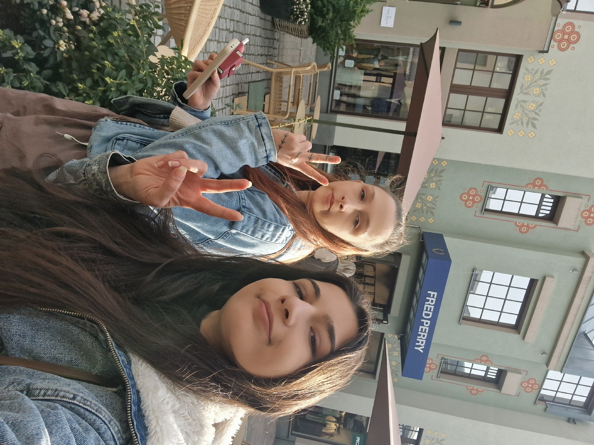 This image captures two young adult females posing outdoors in Wertheim Village, Wertheim, Germany. The female on the left has light brown hair, wears a light-wash denim jacket over a lighter top and brown pants. She holds a white smartphone with a red case in her left hand and forms a peace sign with her right hand; a tattoo resembling leafy branches is visible on her right forearm. She maintains a neutral expression, looking directly forward. The female on the right, positioned closer to the camera, has long dark hair and wears a light-wash denim jacket with a white faux-fur collar over a dark top. Her right hand also displays a peace sign, and she appears to be smiling subtly while looking towards the camera. The background consists of multi-story buildings with distinct architectural features. The building directly behind the subjects is light sage green, decorated with painted yellow floral motifs and reddish-brown circular geometric patterns. A blue awning bearing the white text "FRED PERRY" is affixed to this building. To its left, a light beige building with a visible "HACKETT" sign is present. Both structures feature multiple windows with dark frames. Outdoor café furniture, including light-colored wicker chairs and small tables, is arranged in the midground beneath a large, open, light-brown patio umbrella. The ground is paved with cobblestones, and green foliage in planters is visible in the foreground. The scene is illuminated by natural daylight.