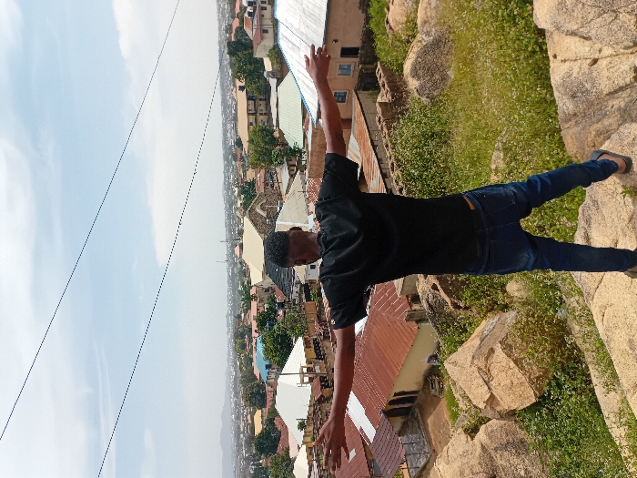 The image presents an elevated wide shot of a city, identified as Jos, Nigeria, under a bright, partly cloudy sky. In the immediate foreground, a single individual, viewed from behind, stands with arms outstretched horizontally on a surface composed of large, light-colored granite rocks interspersed with sparse green vegetation. The person wears a black short-sleeved t-shirt, blue jeans, and dark sandals. Their head is turned slightly to the right, and they face away from the camera, overlooking the cityscape. The mid-ground and background reveal a dense urban landscape featuring numerous buildings with varied roof types, primarily corrugated metal (reddish-brown and silver) and some flat roofs. A distinct structure with a light-colored, possibly tiled roof and arched architectural elements is visible in the mid-distance. The city extends to the horizon, where distant hills or mountains are faintly visible. Two dark utility lines stretch diagonally across the upper portion of the frame against the sky.