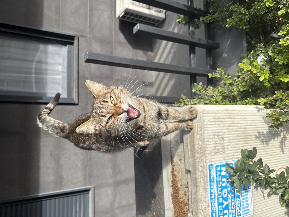 - "A brown and black striped tabby cat, with green eyes, stands on a concrete ledge, captured mid-yawn or vocalization with its mouth wide open, revealing teeth and a pink tongue" by FM-E68DV2, licensed under CC BY 4.0