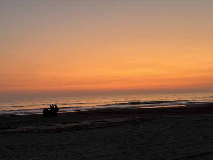 A tranquil beach scene unfolds at sunset. The sky is painted with gradients of orange and pink hues. The ocean meets the shore with gentle waves. Silhouetted against the bright horizon, a group rides a vehicle on the dark sand. Tire tracks mark the beach surface. The scene evokes a sense of serenity and peaceful activity.